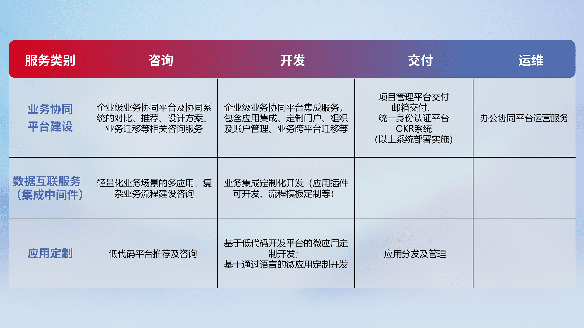 针对钉钉、、企微、、IDaas等平台级产品提供产品的规划、、、、方案、、交付、、、、定制化开发等服务,,,实现如统一协同办公、、、、智能客户服务、、、混合会议管理、、、、智能数据查询、、、、等业务场景,,,实现数字化转型。。。。
